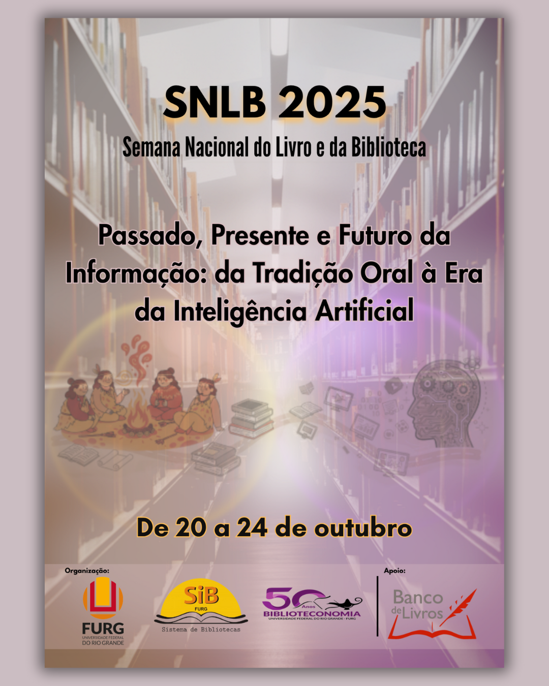 Em 2025, a FURG celebra a Semana Nacional do Livro e da Biblioteca de 20 a 24 de outubro, com o tema “Passado, Presente e Futuro da Informação: da Tradição Oral à Era da Inteligência Artificial”.
